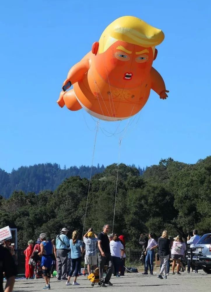 (活动现场川普抗议者放飞气球,图片来自SF gate网站,版权属于原作者)