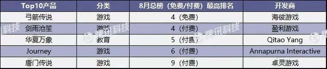 在游戏类别中,5款进入总榜Top 10,其中,以弓箭射击为主的休闲竞技对战新游戏“弓箭传说”,8月31日冲入免费榜总榜第4名。