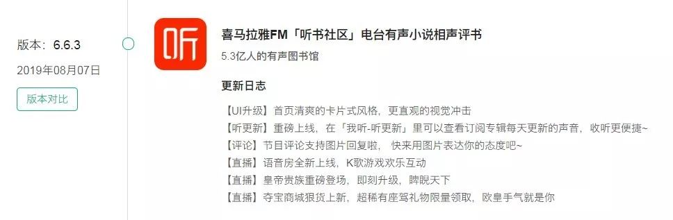 7月底重新上架的喜马拉雅,版本更新至6.6.3版,并上线语音房、K歌游戏互动等新功能:
