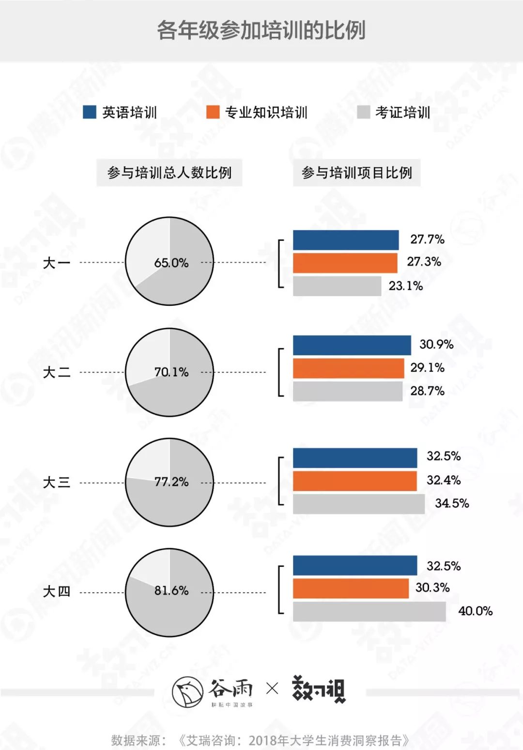 此外,大学生还有一些其他的必要开支,比如服饰、交通、考试等。以考试为例,艾瑞咨询的数据统计显示,70.3%的大学生在读期间参加过各类培训;而且随着年级的升高,对培训的需求越来越大。比如一般大学都要求的四六级,新东方北京的网站上,四六级培训的平均价格为3080,雅思、托福的培训费用则更加高昂。