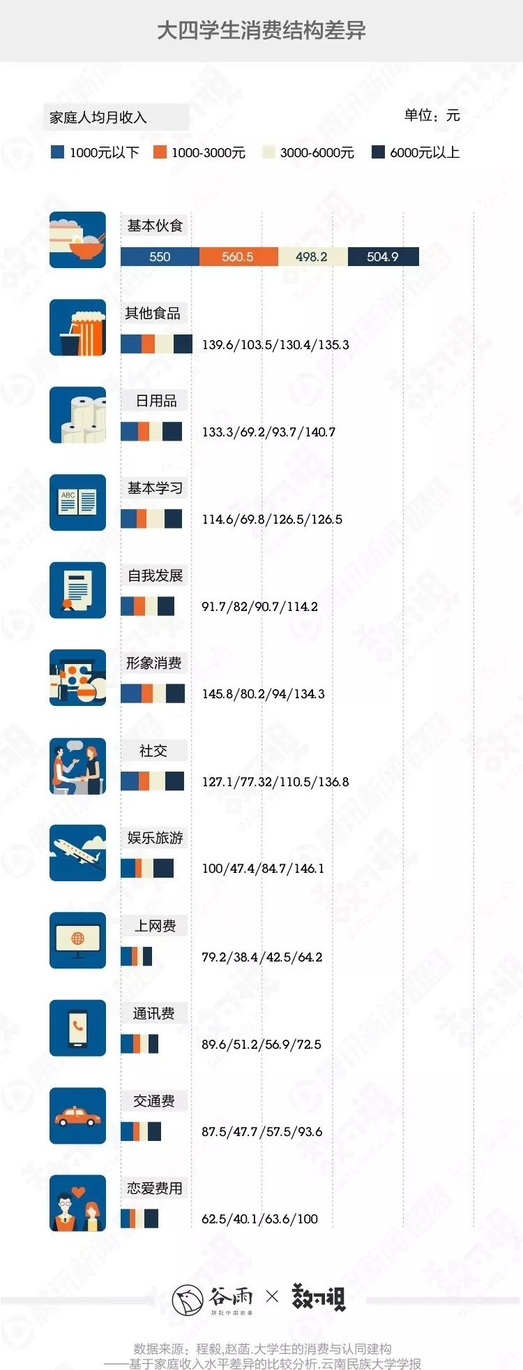 有学者发现,从大一到大四,家庭收入对于大学生生活费的影响是逐渐减弱的趋势,大四阶段还出现了低收入家庭的学生"逆袭"的情况:最低收入家庭的学生在形象、社交、自我发展、其他食品的消费超过了高收入家庭。这和他们对于家庭收入的依赖较低有关,各组大学生以家庭为主要经济来源的比例依次为66.7%、76.7%、91.6%、88.2%。穷人家的孩子早当家是有道理的。