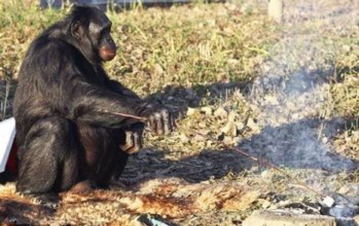 倭黑猩猩茨兹,不但能够熟练地使用烤架和烤叉等工具,甚至能够自己使用火柴生火。