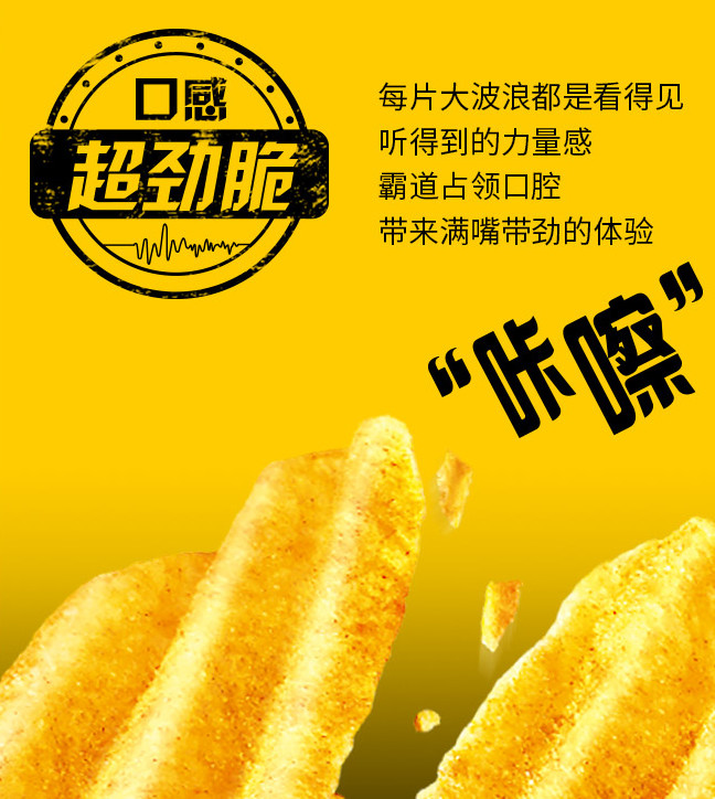 乐事的大波浪系列,就很鲜明地突出“超劲脆”的口感,波浪的造型从视觉、听觉上都能给消费者带来冲击的力量感。