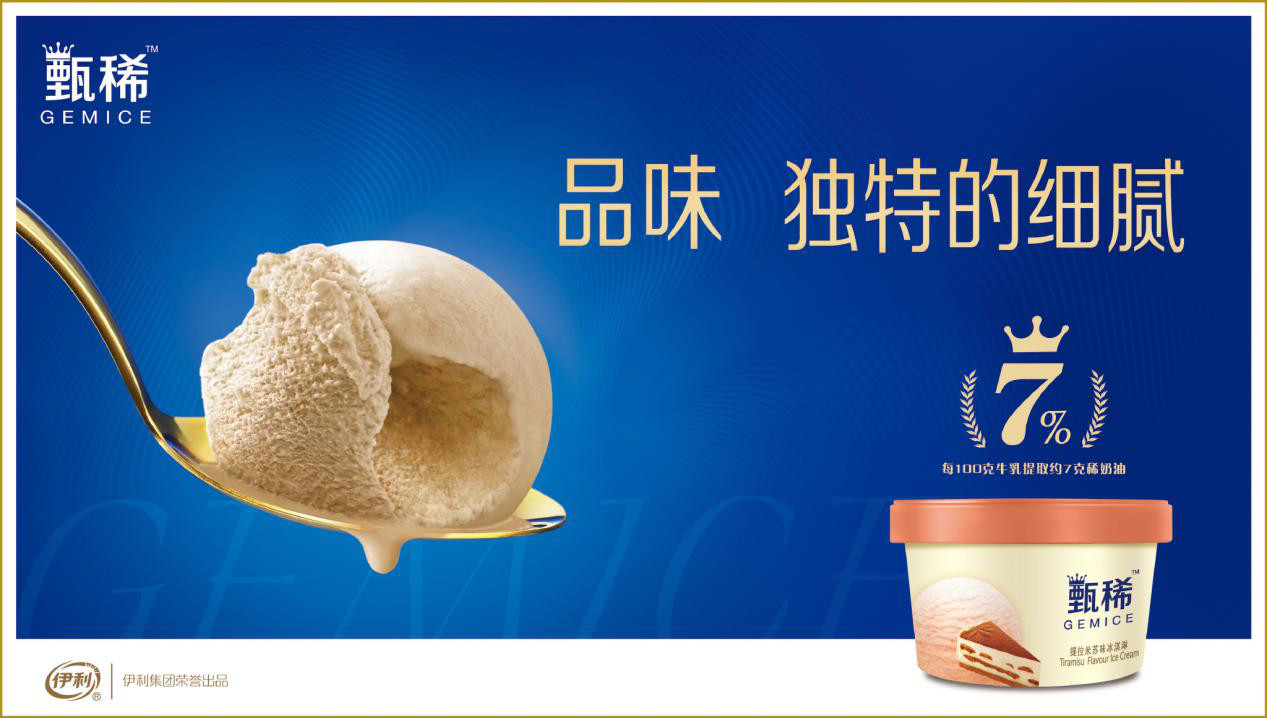 市面上许多冰淇淋,都以口味为卖点,如奶香四溢、果味十足,如何在这样的市场中打造差异化?2018年甄稀进行了全面的品牌升级,找到了口感的突破口。用“7%的独特细腻”替代了原来的“稀奶油”,同样是向消费者传达每100克牛乳提取7克稀奶油,但“细腻”能让消费者更直观地感受到甄稀的不同。