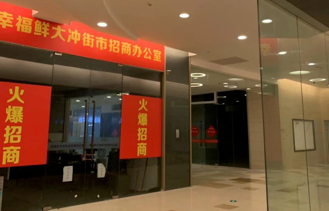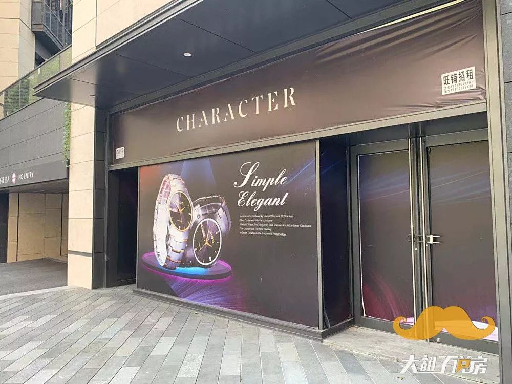 商铺的玻璃上包着广告封纸,上面写着招租热线,从裸露的地方透进去看,依然是最原始的毛坯状态。
