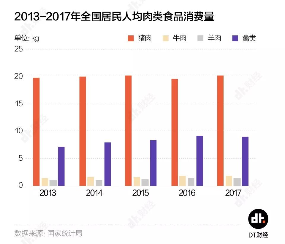 与其他肉类的对比,更体现出我们对猪肉的依赖。根据统计局调研数据,2017年中国人均消费猪肉20.11公斤,而人均牛、羊肉消费量只有1.87公斤和1.33公斤。