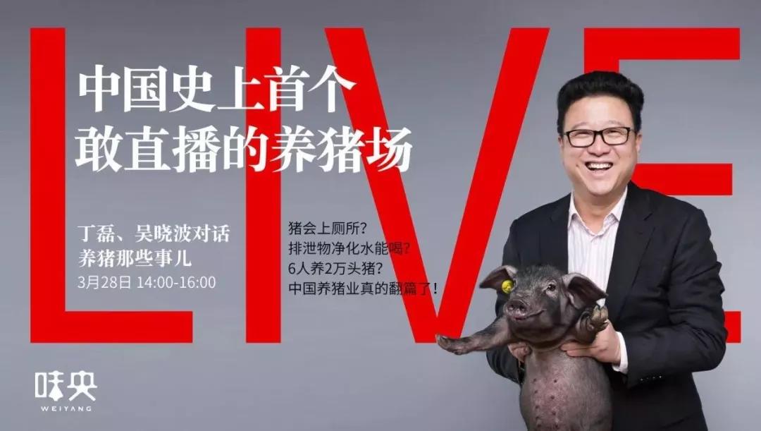 (图片说明:丁磊为“丁家猪”打造了一场直播盛宴,并且与财经作家吴晓波畅谈养猪心得)