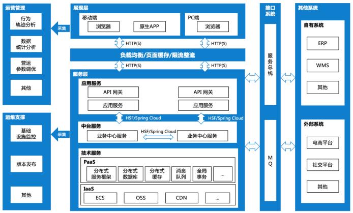 技术架构总体上分为展现层、服务层、接口系统、运营管理和运维支撑。