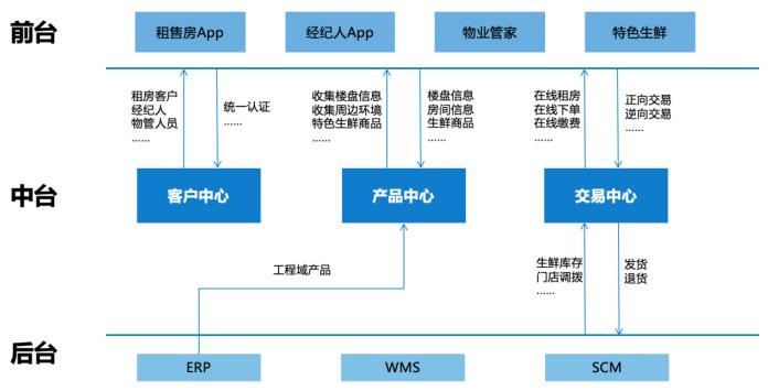 为了简化业务流程,根据前期的业务分析,结合0级架构的设计,我们可规划出企业的业务数据流(以房屋租赁行业为例,多业态),如下图所示。