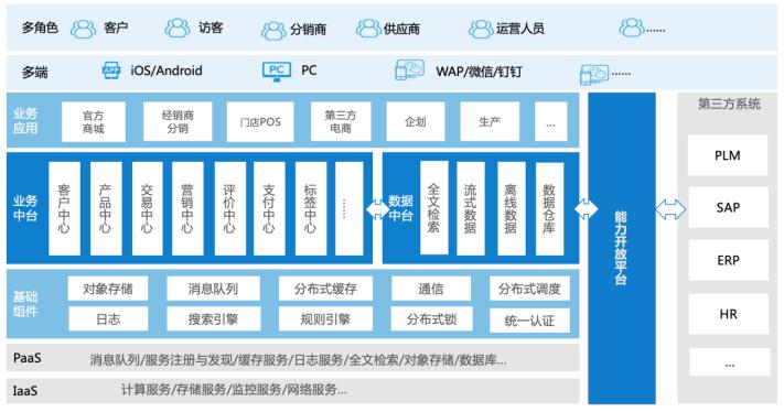 从上图中我们可以看到,企业整体功能架构从下往上分为IaaS层、PaaS层、基础组件层、数字中台层(包括业务中台和数据中台)和业务应用层。每一层的具体功能如下: