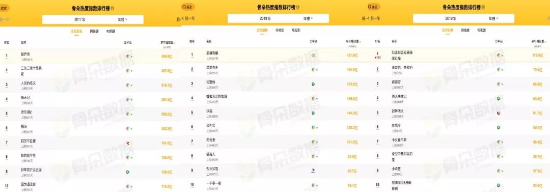 根据骨朵数据显示,2017年播放量最高的剧集前三名分别为古装传奇剧《楚乔传》、玄幻剧《三生三世十里桃花》以及当代反腐题材的《人民的名义》;2018年前三名则为宫廷剧《延禧攻略》、都市情感剧《恋爱先生》以及宫廷剧《如懿传》;而2019年截止到目前为止,前三名分别为古装剧《知否知否应是绿肥红瘦》、都市言情剧《亲爱的,热爱的》以及都市题材的《都挺好》。