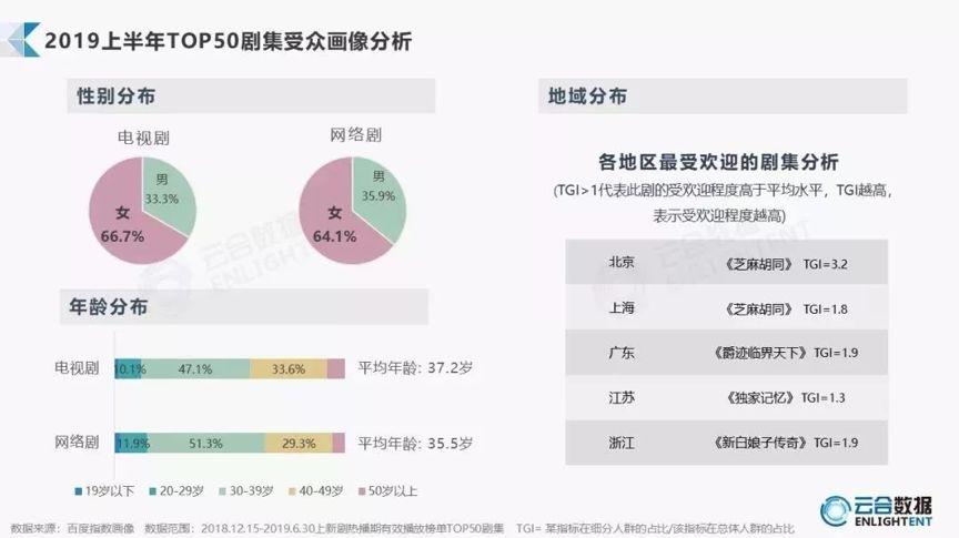 但生活不止诗和远方,眼前的苟且也不能忽视。根据云合数据显示,2019上半年top50剧集受众以女性为主,电视剧和网络剧占比分别为66.7%和64.1%;而不论是电视剧用户还是网络剧用户,平均年龄均超过35岁。可以说,中青年女性是剧集市场最主要的受众群体。