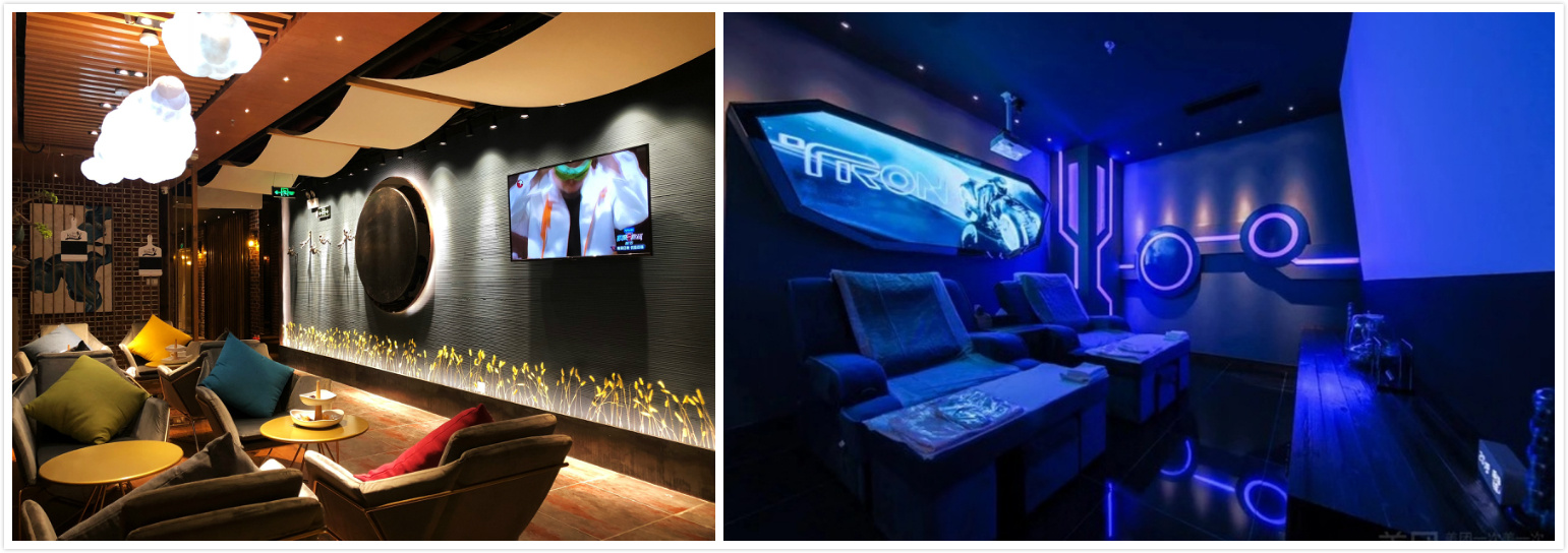 设计:“比起常规的按摩店,Xin SPAce 乍一看更像一间咖啡馆”,郭骁形容道。保证设计的年轻化和潮流之外,同时也要兼顾标准化,Xin SPAce 的解决方案是提供模块化设计模板。单店一般 10-15 个房间,Xin SPAce 储备了 40 多个模板,根据所在地区和文化来决定不同风格。