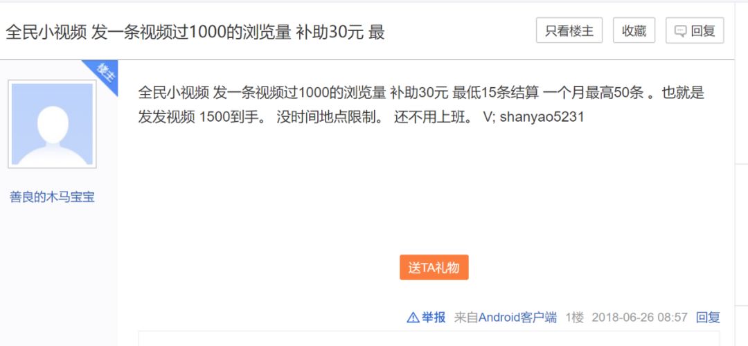 百度的全民小视频也以“高额补贴”著称,其补贴最高峰时,有人计算“只要每天发的视频发布2个,播放超了1000次,一个月就有2400元的补贴”,而高额补贴甚至带动了一系列类似“招聘打字员”式的病毒式次生产业诞生。