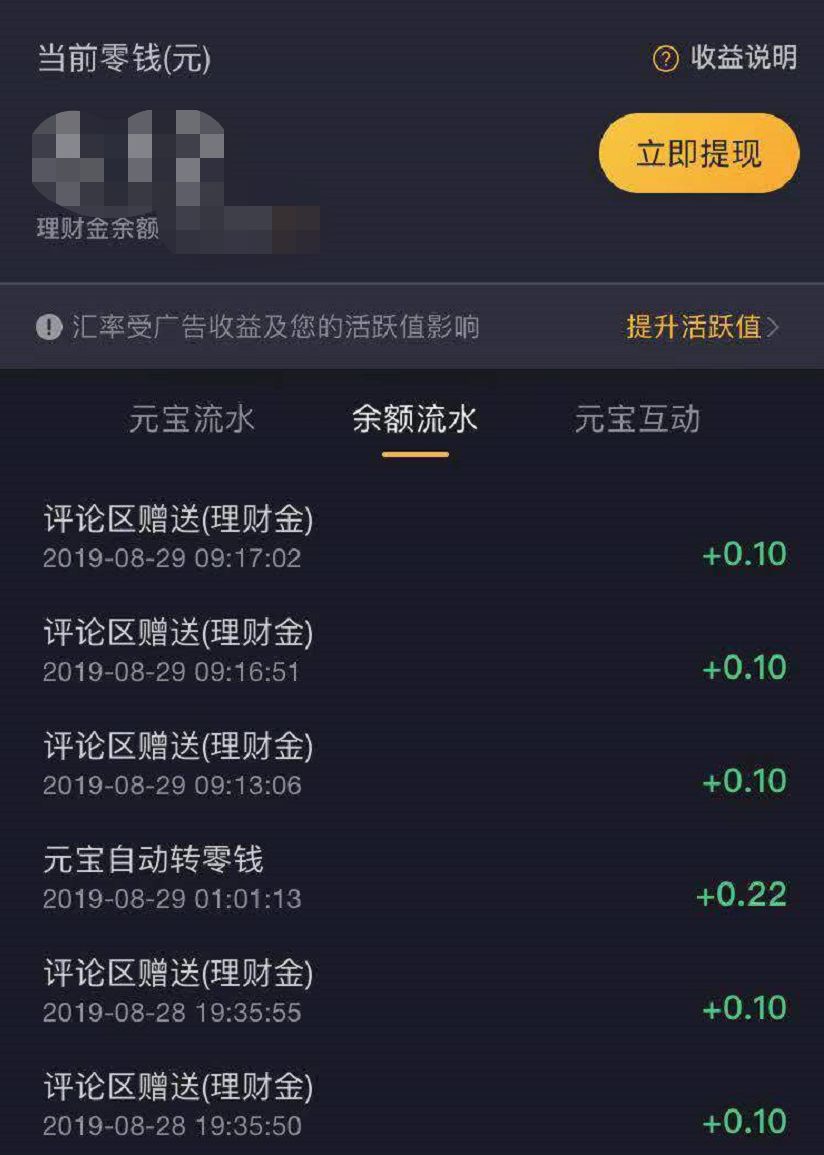在刷宝的结算规则中,如果一个视频想要获得20元的视频补贴,不仅与视频播放量挂钩,还与时间和关注率挂钩(类似24小时内达到10万播放量,且有4%以上的关注率)。而短视频创作者的另一种收益形式,即观众打赏所获得的“视频元宝”,则是以理财金的形式自动转入的。