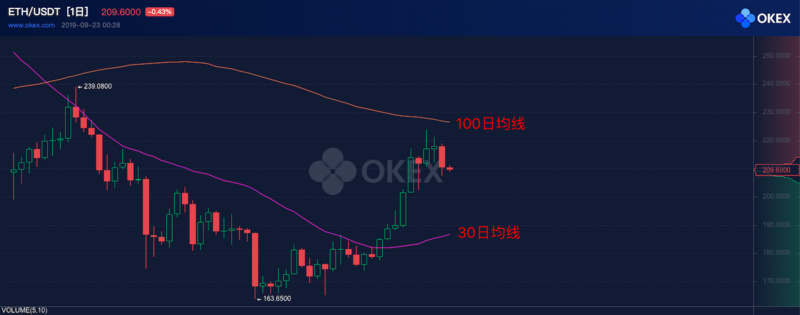 OKEx行情数据显示,本周,ETH 价格一度升高至 224 美元,周内收于 210.51 USDT,环比上涨 11.5%。