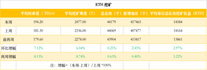 etherchain.org 数据显示,目前平均挖矿难度 2477 T,环比上涨 6%;平均算力上涨 7%,暂报 194.2TH/s;随着币价回暖,矿工活跃度上升,新增地址环比上涨 2.5%。