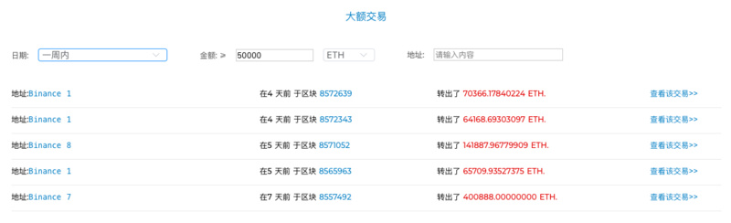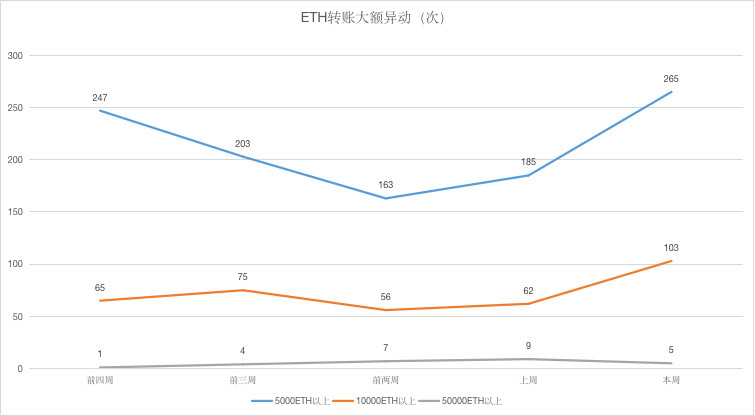 本周,“5 万 ETH 以上”转账次数共计 5 笔,最大转账金额超过 40 万个 ETH,并且所有转账均为币安钱包互转。