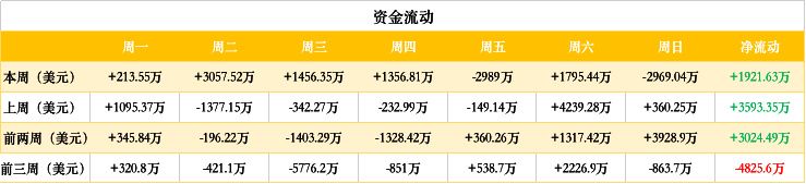 资金方面,本周资金波动较大,周五净流出资金最多,超过 2900 万美元;周二净流入资金较高,将近 3000 万美元。