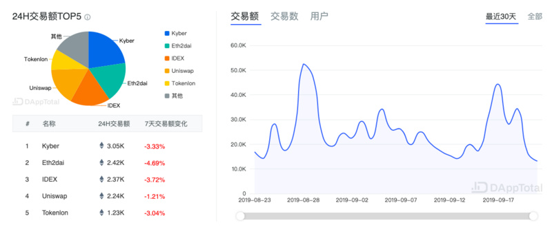 据 DAppTotal.com DEX专题页面数据显示:已统计的 17 个基于以太坊网络的 DEX 项目,过去一周链上交易额共计 185660 个 ETH(约 3900 万美元),环比下上涨 40%。