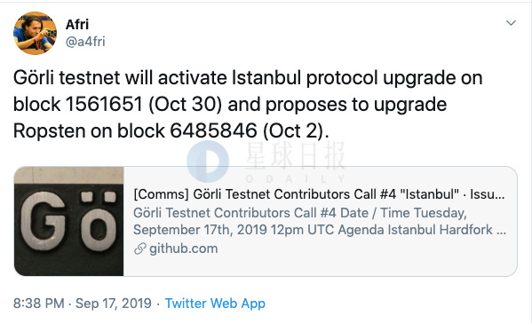 前以太坊核心开发人员、现以太坊测试网首席开发者Afri Schoedon在推特上再次公布以太坊伊斯坦布尔升级测试网具体升级时间:以太坊测试网Gorli将于区块1561651升级,预计升级时间为10月30日;以太坊测试网Ropsten将于区块6485846升级,预计升级时间为10月2日。