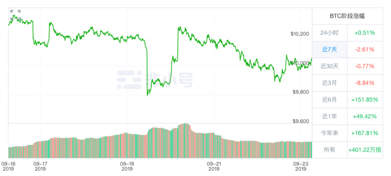 本周比特币7日跌幅2.6%,震荡区间相较于上周整体下降150美元,短时最大涨跌幅仍为3.5%。9月19日凌晨,币价曾跌破1万美元,但在6小时见底,一年内回升。