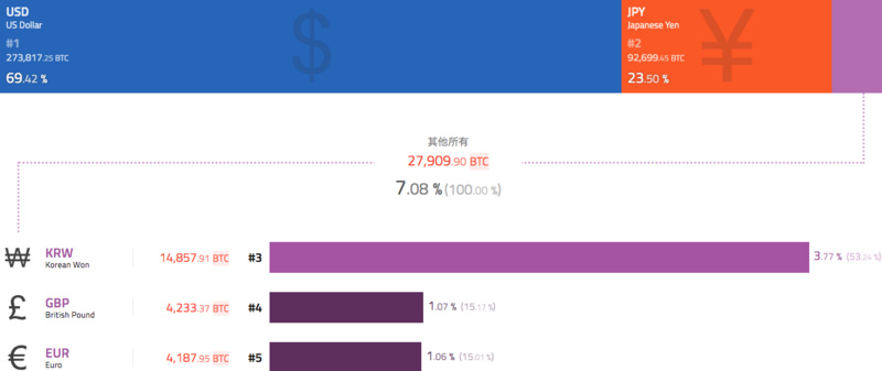 本周比特币兑法币交易中,美元排名第一,占比69.42%,相较于上周微涨;排名第二的日元占比也微涨8%至23.5%;最近一直处于不稳定状态的韩元停涨回调28%至3.77%;英镑占比下跌27%%;欧元占比下跌8%。