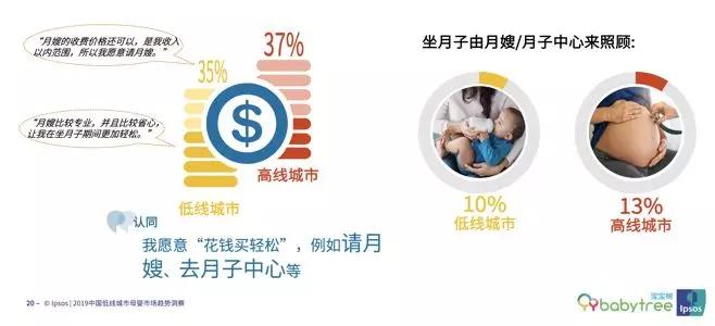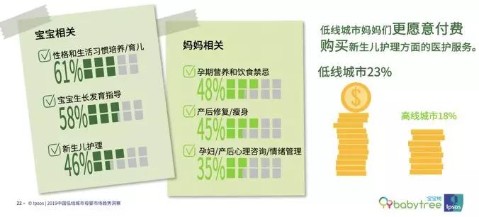 一组数据佐证,在低线城市妈妈们更愿意付费购买新生儿护理方面的医护服务的比例达23%,高于一二线城市的18%。