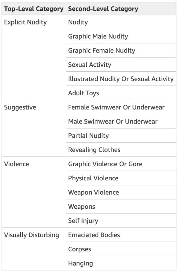 这个AI不是只会找裸体。Rekognition的神经网络已经过训练,可以检测各种可疑内容,包括枪支或暴力图像或一般会令人不安的内容。下面是Rekognition 网站上的功能分类: