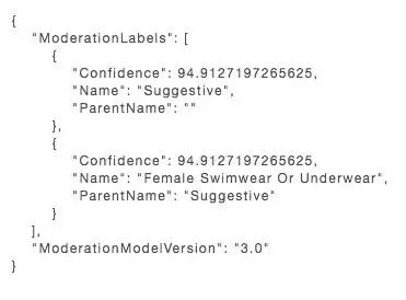 然后Amazon的深度神经网络就会对图像进行处理,从中发现内容并对任何可能令人反感的图像类型进行标记。神经网络会输出有关图像内容的元数据,以及表示对图像所打标签确信度的百分比。结果看起来是这样子的: