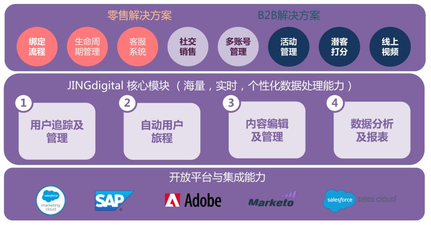 为了给企业沉淀一手用户数据库,JINGdigital还与主流CRM系统集成,支持Salesforce、Microsoft Dynamics、Adobe Neolane以及SAP Hybris等。