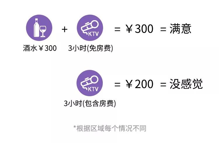 很多人去KTV的时候,第一眼看到的就是单纯的包时段价格,比如3个小时200块,这一下就先入为主了;然后就会有其他的套餐,比如购买300块的酒水零食可以免房费,这样大部分消费者都会新选择300块免房费的套餐。