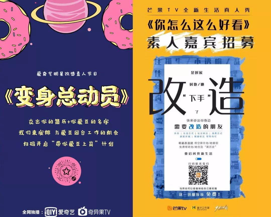在星粉互动类节目里面,爱奇艺明星改造素人节目《变身总动员》日前发布了招募海报,并且官宣了Angelababy作为嘉宾正式加盟;与之产生竞争的是,芒果TV治愈系生活真人秀《你怎么这么好看》也陆续展开了素人嘉宾海选和意见领袖招募。