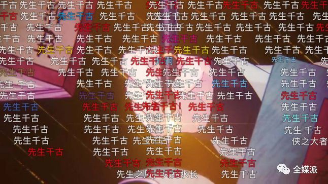 但从整个屏幕上来看,五颜六色的刷屏弹幕更像是一场文字烟花:在刷屏中,观众无法获取任何弹幕的文字信息,只能看到占满整个屏幕的绚烂流动,就像观看一场具有社会文化仪式感的烟花狂欢。
