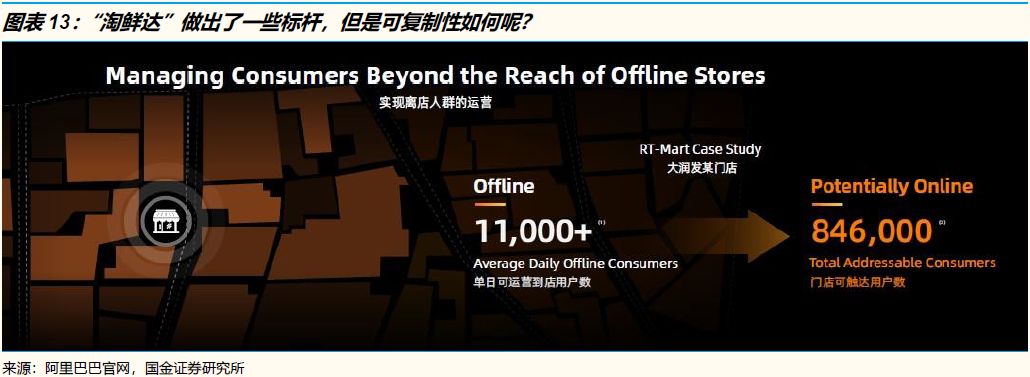 以大润发为例:某门店原先每日触达人数11000人,经过改造,现在是864000人!过去9个月,淘鲜达已经完成了485个门店改造、18000个SKU改造,线上履约及时率在99%以上,日均线上订单700个以上,平均每个店GMV增长6.5%。淘鲜达的典型用户画像:54%在淘宝系的年消费在6000元以上,34%是90后,老客户平均月购买频次为2.35次——所谓的“高价值、年轻化”。