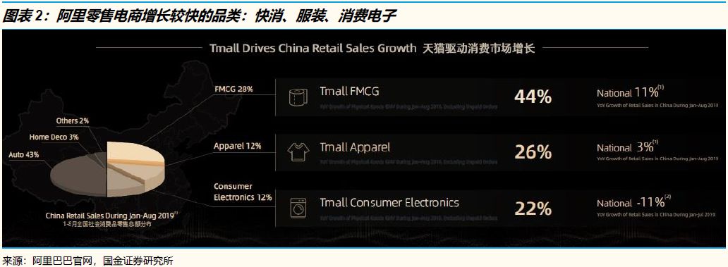 天猫仍然维持着较快的GMV增速,其中贡献较大的品类是:快消,同比增长44%(2019日历年1-8月数据,下同),同期全国总体零售GMV增长11%;服装,同比增长26%,同期全国总体GMV增长3%;消费电子,同比增长22%,同期全国总体零售GMV下滑11%。可以看到,这几个品类在天猫的GMV增速都远远跑赢了全国零售增速。天猫强大的运营能力、完善的基础设施和对用户的理解,一次又一次地立功了。