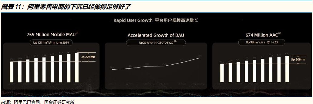 2017年开始,阿里零售电商业务(主要是淘宝/天猫)的用户下沉就取得了显著进展,活跃买家快速增长。2019日历年二季度(2020财年一季度),DAU同比增长26%,增速甚至呈现不断上升的势头。2018-19财年(截止2019日历年一季度),淘宝/天猫的下沉市场人口渗透率高达40%;70%的新增用户来自下沉市场;下沉市场新增用户第一年的购物ARPU平均值高于2000元人民币。