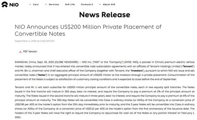 根据该协议,蔚来汽车将通过私募方式向投资者发行和出售总额为2亿美元的可转换债券。此次债券发售预计将于今年9月底前完成。腾讯旗下的附属公司和李斌将分别认购1亿美元的可转换债券本金,且各自分两次平均认购。第一批发行的债券将在360天内到期,不会产生利息,但要求蔚来汽车在到期时支付本金2%的溢价。第二批发行的债券将在三年内到期,也不会产生利息,但要求蔚来汽车在到期时支付本金6%的溢价。