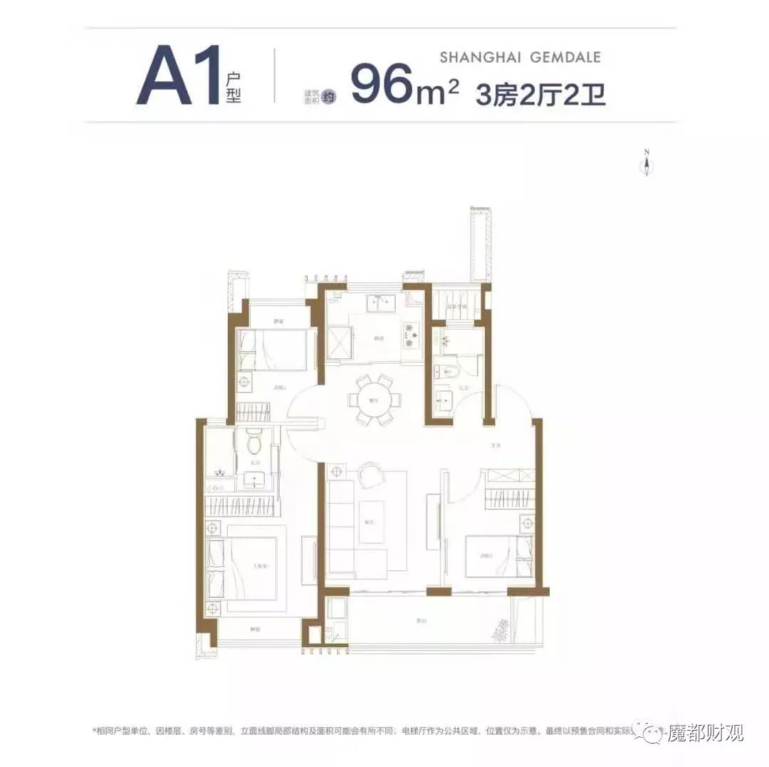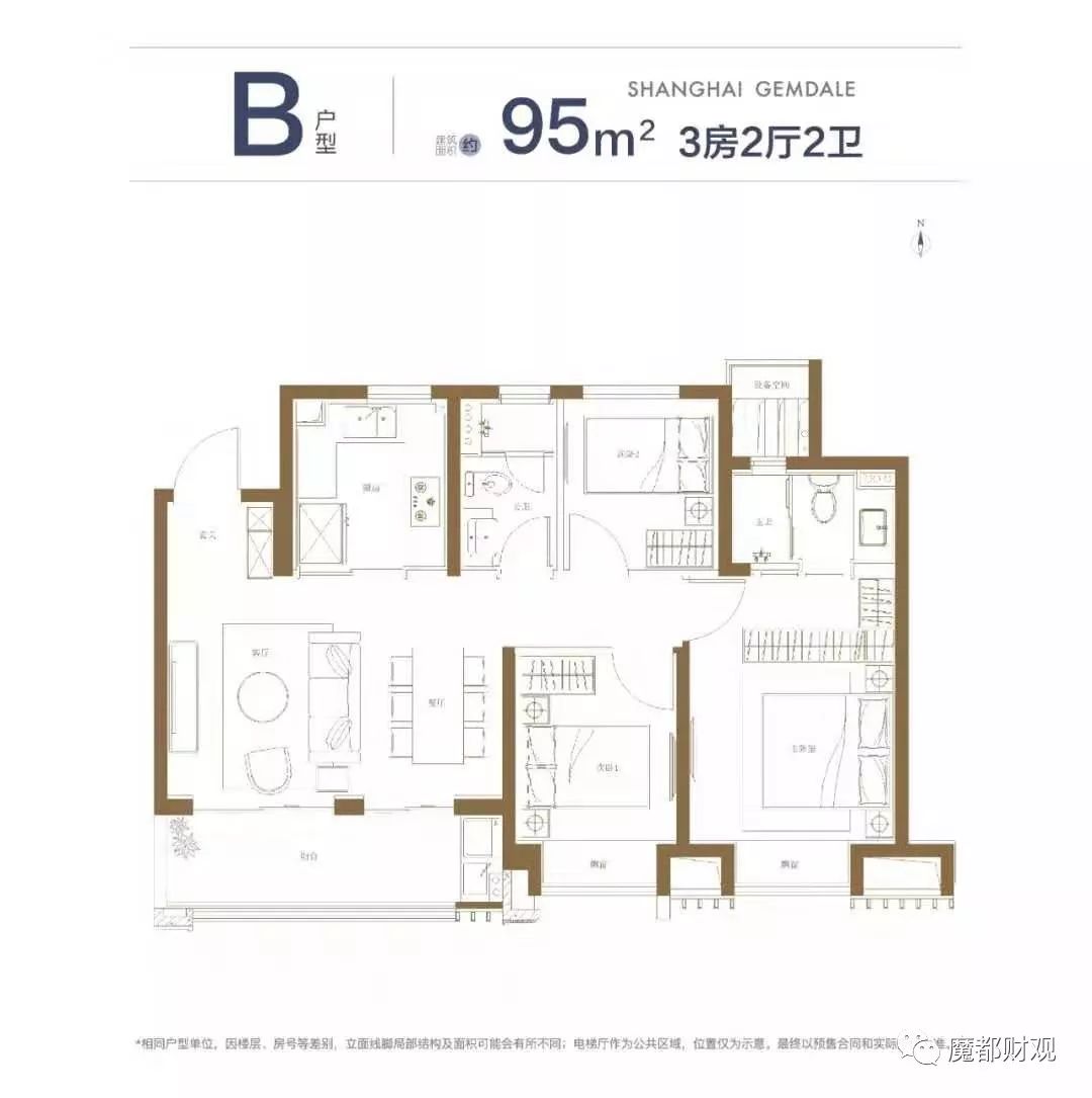 我们来看看位于上海泗泾的金地玺悦,就功能性而言,95平米面积段做出这样的三房可以说是极致了,三开间朝南+大横厅设计,主卧自带衣帽间。