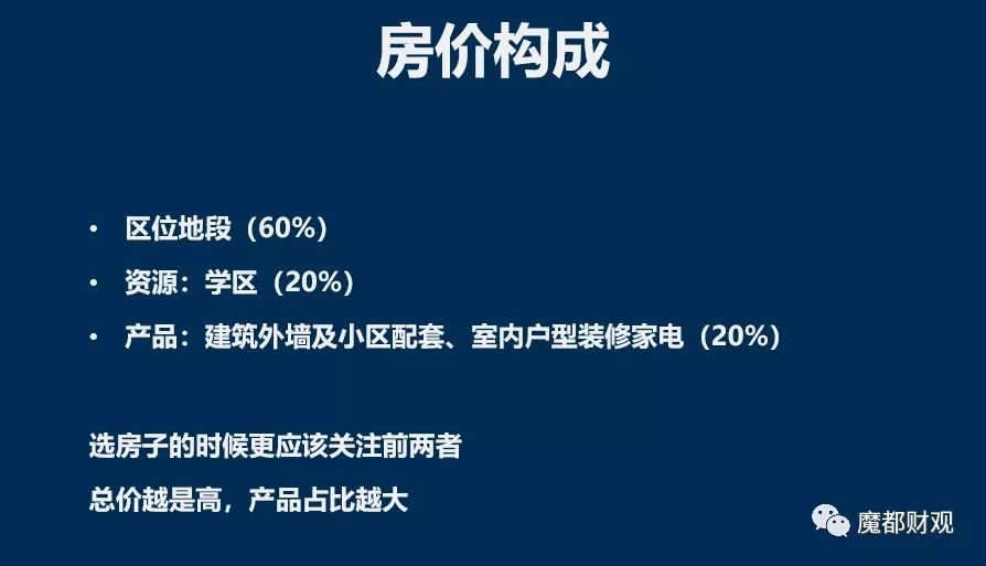 我们先来看看一般的住宅,是如何界定房价构成的。大概是地段吃到60%,学区医疗资源20%,产品占到20%。