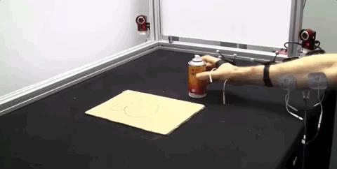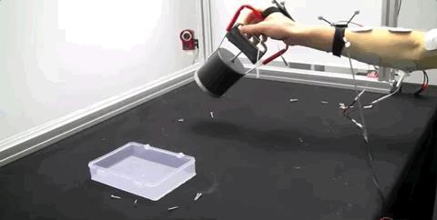在喷雾罐实验中,Lopes 博士使用该穿戴设备,能让参与者在使用喷雾罐前自动摇匀瓶罐,然后再自动让手打开喷雾罐的开关。
