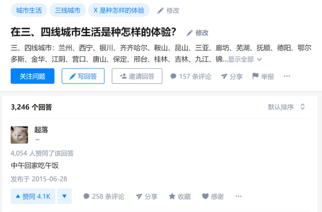 知乎上有一个浏览量超过800万的经典问题“在三、四线城市生活是种怎样的体验”,其中一个高赞答案引起了很多人的共鸣:“中午回家吃饭”。
