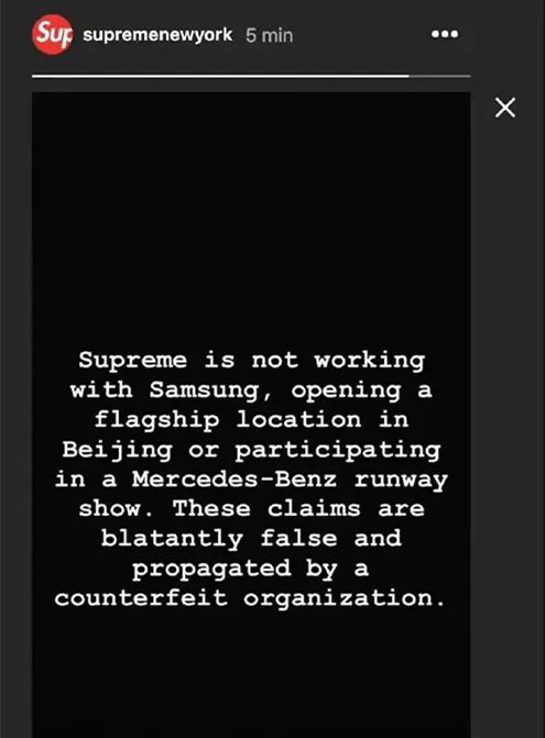 Supreme也在发布会之后也迅速澄清,称没有跟三星合作,也没有在北京开7 层旗舰店和在梅赛德斯-奔驰文化中心举行中国首秀的打算,这些说法都是一家山寨公司的虚假编造和传播。