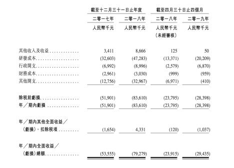 从财务数据来看,作为又一家未盈利上市的生物科技公司,中国抗体2018年以及2019年前四个月分别亏损8361万元和2840万元。其中研发成本支出为亏损主要原因,2018年及2019年前四个月研发费用达到4728万和2021万元。