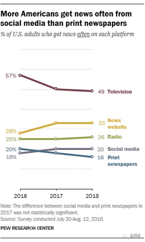 比起纸媒,更多美国人选择通过社交媒体看新闻。2018年,五分之一的成年人表示他们常常通过社交媒体获取新闻。Facebook在社交媒体新闻渠道中继续领跑,成为四成受访者(43%)在线看新闻的选择。