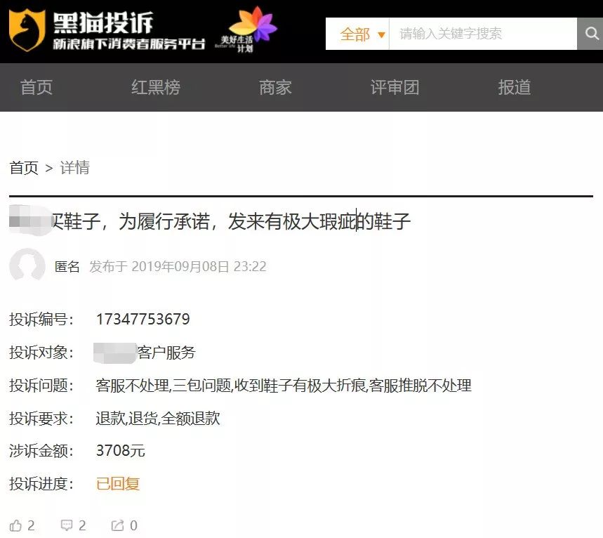 比如在黑猫投诉上,有用户以3708元在某平台上购买了一款球鞋,但最终发现鞋子有极大折痕,客服推脱不处理。 也有用户反馈第一次买的鞋和第二次有很大区别,怀疑第一次购买的携是假的。