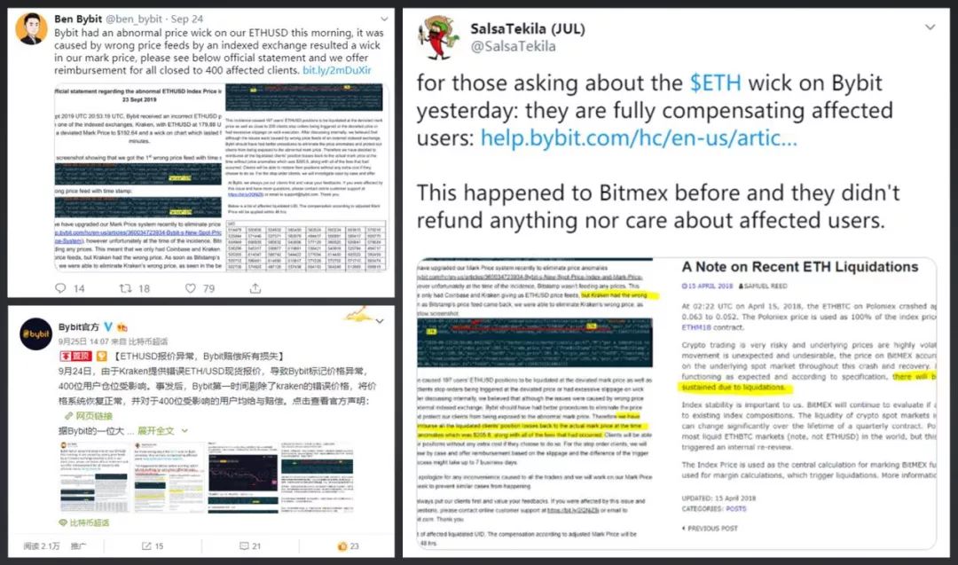 因受到三大交易所之一Kraken提供的错误报价,导致 ETH/USD 交易对被“插针”,Bybit 场内价格偏离市场价格20美金左右,全球近400名用户被拉爆或止损。Ben 及 Bybit 官方第一时间在社交媒体上公开透明了事发经过并公布了处理方案。