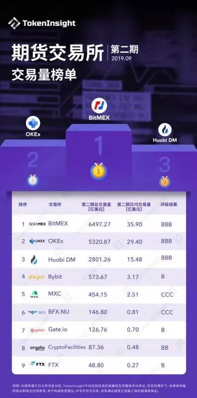 加密数据分析公司 TokenInsight 根据交易所 2019 年 2 月至 7 月的数据发布了新一轮数字通证期货交易所评级,评级报告《期货交易所行业2019 Q2研究报告》显示,目前占据合约交易量前三位的交易所仍为 BitMEX、OKEx 和 火币DM,本期期货总交易量分别为 6,497 亿美元、5,321 亿美元和 2,801 亿美元。