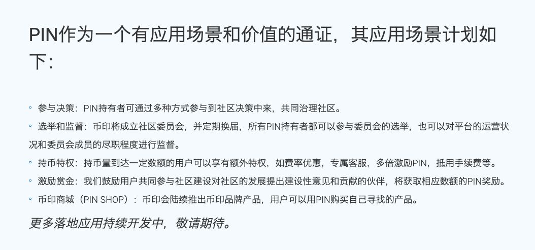 PIN 则拥有更多应用场景:参与抉择、选举监督、持币特权、激励赏金、币印商城。