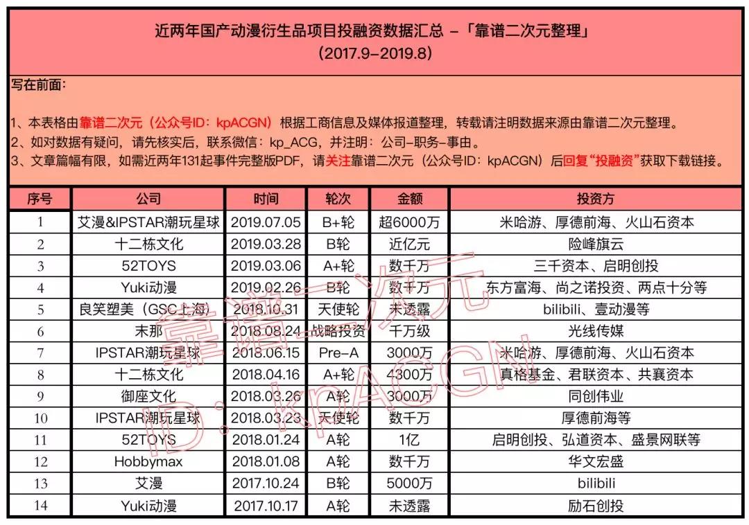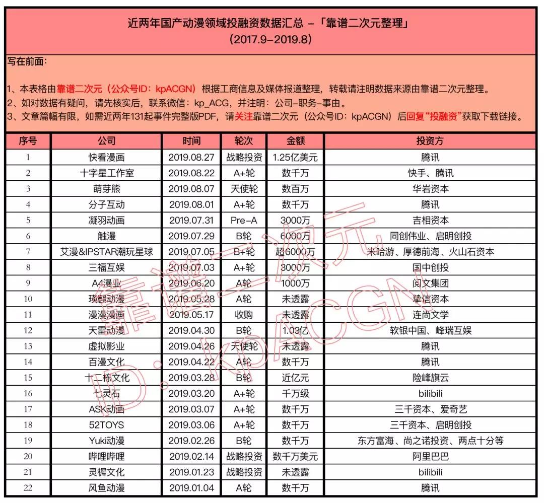 靠谱编辑部(ID:kpACGN)根据工商变更及媒体报道整理了2017年9月到2019年8月两年来动漫领域的投融资事件,共131起。